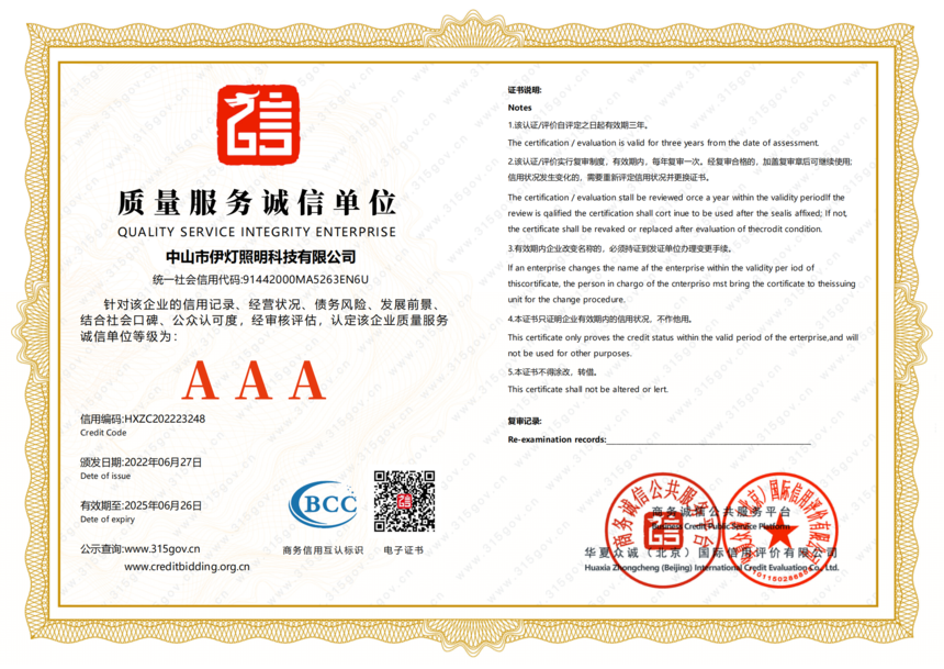 诚信经营 稳健发展,伊灯照明喜获“AAA级信用企业”称号随着市场竞争的日益激烈,国家积极推进信用体系建设,营造良好的信用环境已经成为企业长足发展的重要前提。凭着诚信经营、稳健发展的原则以及良好的社会口碑与公众认可度,近日,伊灯照明被授予“AAA级信用企业”荣誉称号;伊灯照明总经理华竹被光荣授予诚信企业家和诚信经理人称号。